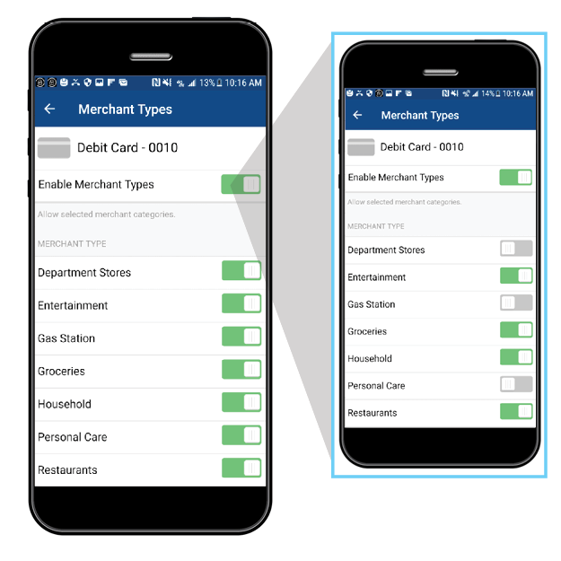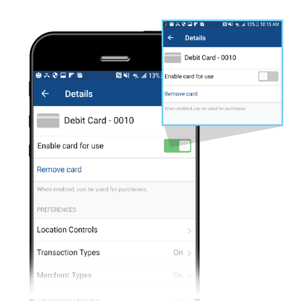 Control when, where and how your debit card can be used. Turn card On/Off | Set Purchase Limits | Control Transaction & Merchant Types | Designate Use by Geographic Locations.